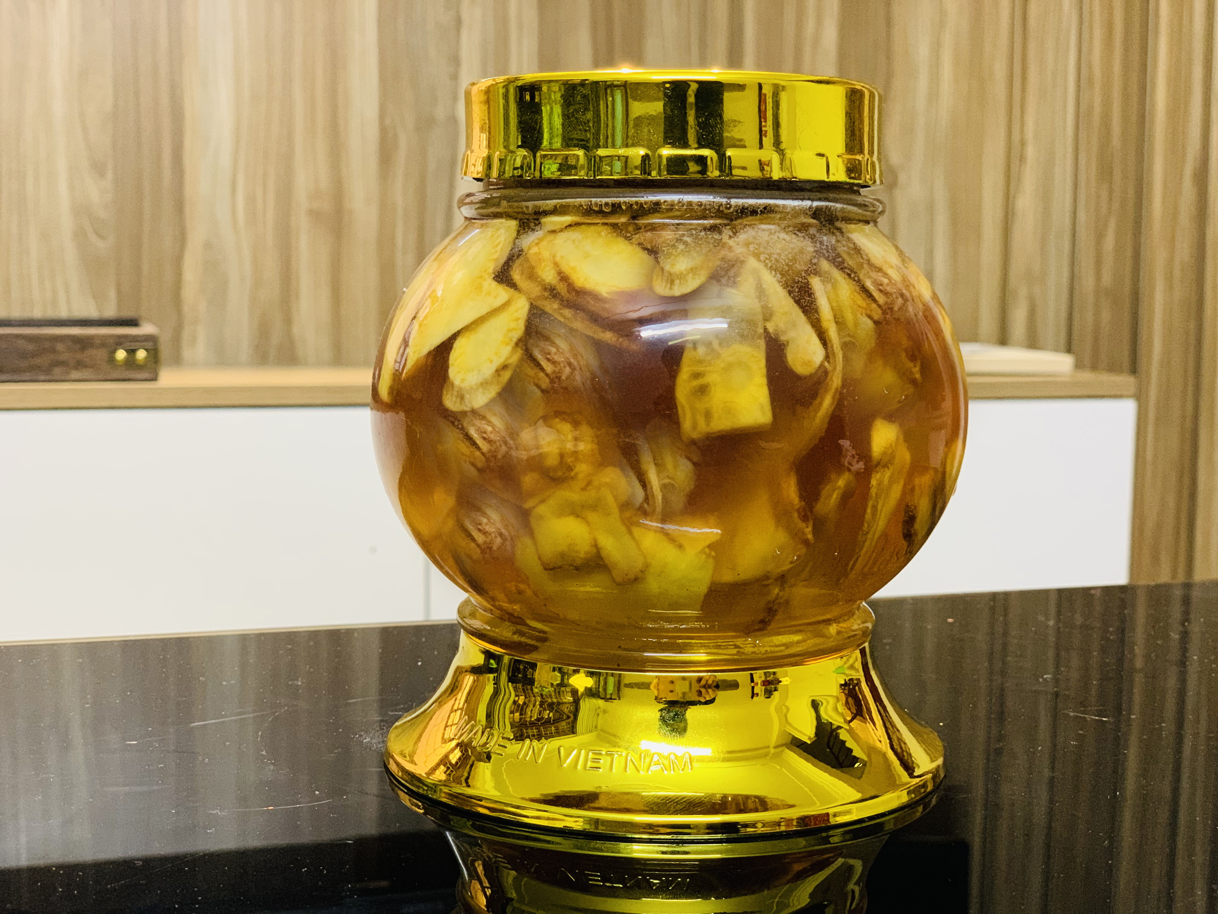 - Đổ mật ong vào bình sao cho ngập sâm.